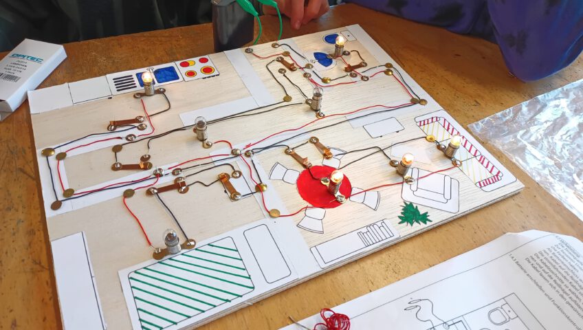 Links: Eine schöne Lötnaht am Knatterboot von Alex Reimer (Stufe 10). Rechts: elektrische Hausinstallation von Fiona Trummer und Clara Schwenz …