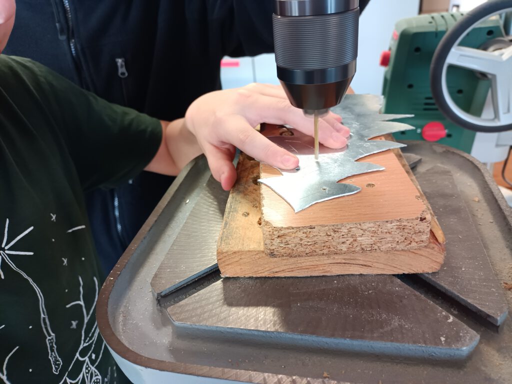 Advent im Technikraum 25. November 2024 C Koechling Aus dem Technikkurs 8: Aus einem Alublech wird ein Teelichthalter gefertigt (Malte Lieck).