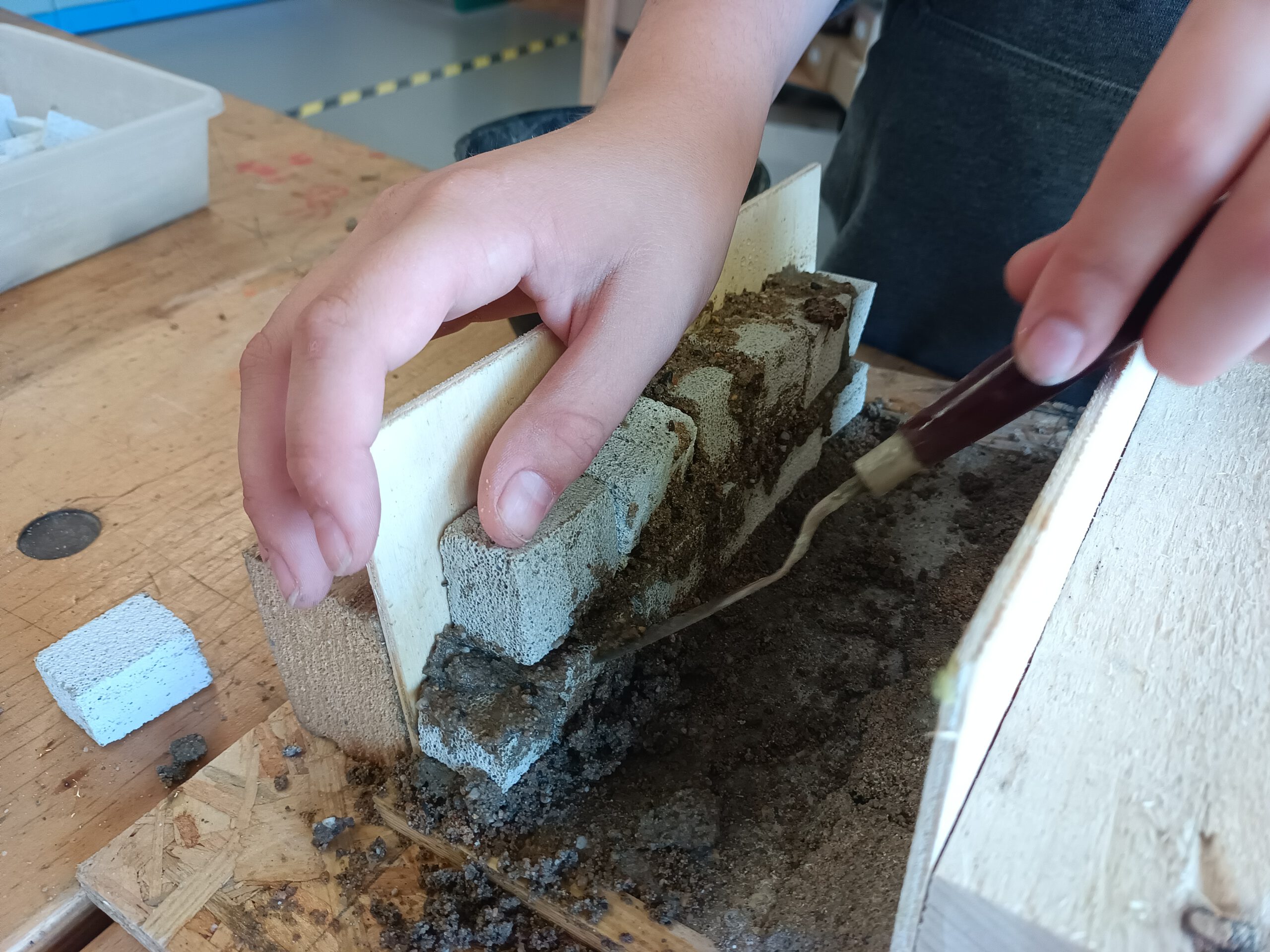 Auftrag des wasserdichten Innenputzes (opus signinum) auf der Kanalsohle und den Innenwänden. Die römischen Baumeister verwendeten Ziegelmehl, das hier durch ein Pigmentpulver ersetzt wurde. Die etwas reichliche Dosierung führt an…