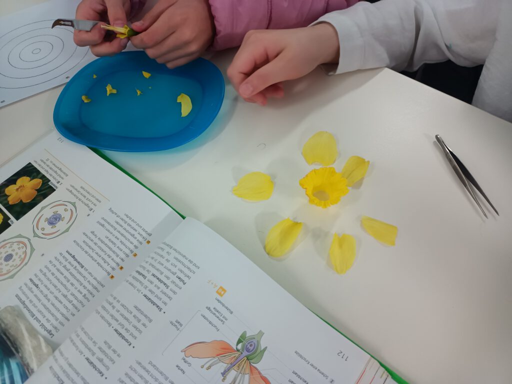 Sektion von Tulpen- und Narzissenblüten in der 5d und der 5a: In Partnerarbeit wurden Blüten seziert, dann zu Legebildern gefügt und Blütendiagramme gezeichnet. Ein passender Lehrfilm ergänzte das Programm.