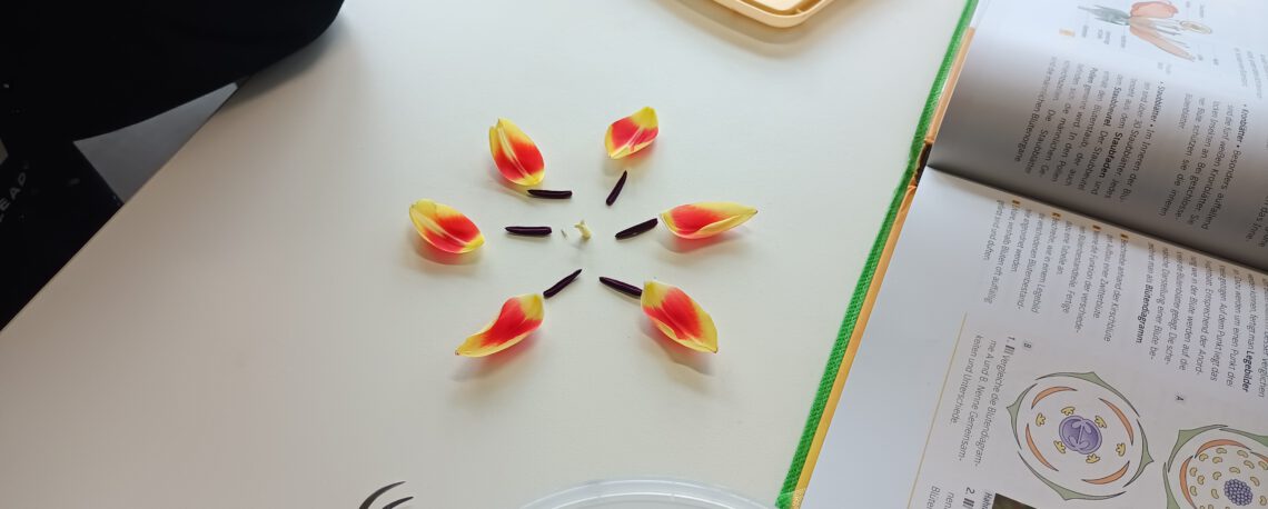 Sektion von Tulpen- und Narzissenblüten in der 5d und der 5a: In Partnerarbeit wurden Blüten seziert, dann zu Legebildern gefügt und Blütendiagramme gezeichnet. Ein passender Lehrfilm ergänzte das Programm.