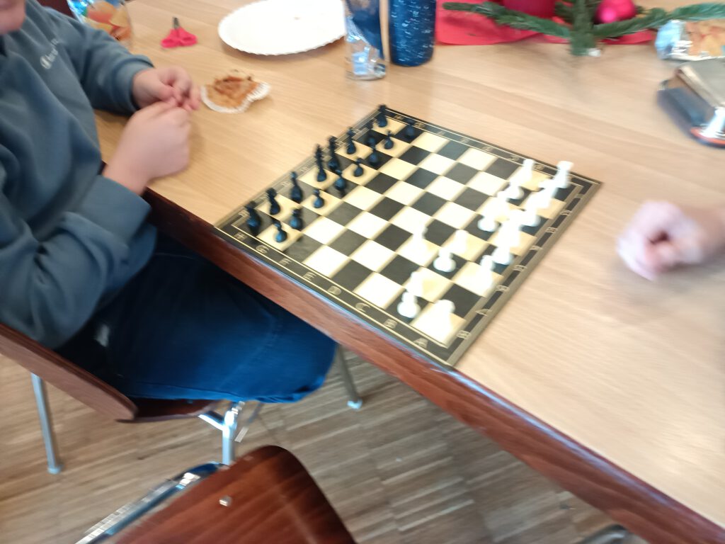 Zeitvertreib während der Pause im Magic Winter Café in der Aula: Fünftklässler beim Schachspiel