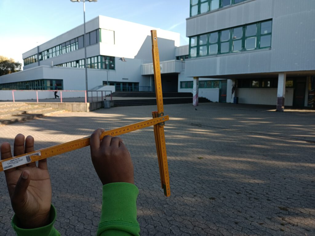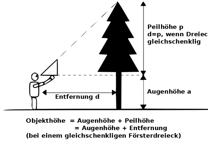 Anwendung des zweiten Strahlensatzes in der Praxis: Der Gliedermaßstab („Zollstock“) bildet ein gleichschenkliges Dreieck. Bringt man den zu messenden Gegenstand – hier das Gebäude – mit der Grundseite optisch zur Deckung, entspricht die Distanz zum Gegenstand der Höhe desselben. So lassen sich z.B. schnell und einfach Baumhöhen ermitteln. Wird wie in der Zeichnung ein rechtwinkliges Dreieck (Försterdreieck) verwendet – der Zollstock muss dann anders aufgeklappt werden – ist die Messung noch exakter.