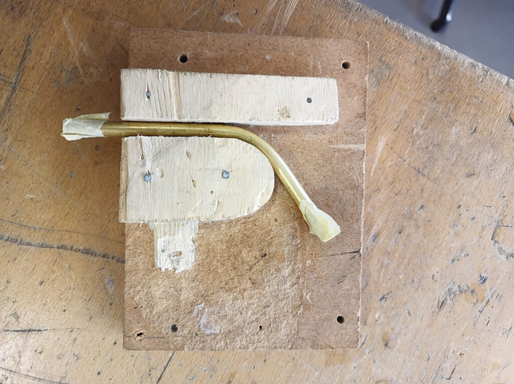 Biegen einer Dampfleitung für das Knatterboot: In einem selbst gebauten Werkzeug wird das sandgefüllte Rohr in Form gebogen. Die Sandfüllung verhindert das Abknicken.