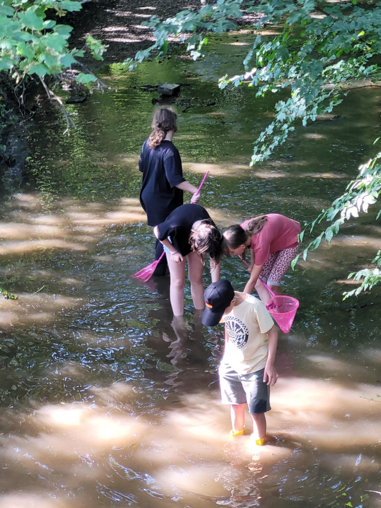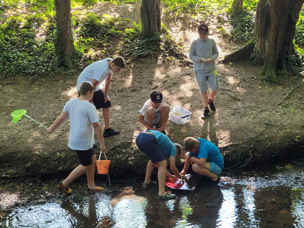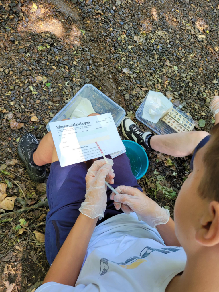 Hier prüften die Schüler:innen neben dem pH- und Nitrat-Wert auch den Kalkgehalt des Gewässers mit Hilfe von Schnelltests und Analysebögen. Ebenso nutzten sie Kescher um vorsichtig Wasserorganismen zu fangen, zu beschreiben und letztlich wieder auszusetzen.