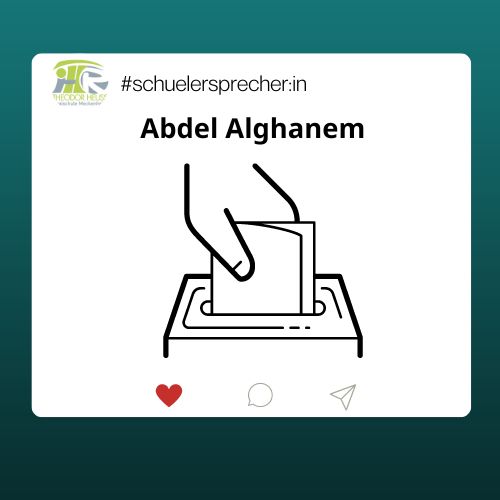 Hallo, mein Name ist Abdel. Ich bin in der Klasse 9c. Meine Hobbys sind Gaming und manchmal einfach Spazierengehen. Ich möchte Schülersprecher werden, weil ich die Meinung aller Schülerinnen und Schüler hören möchte. Außerdem werde ich mein Bestes tun, um ihre Anfragen zu verstehen und zu erledigen. Ihr könnt mich auch jederzeit ansprechen, wenn ihr Fragen habt.