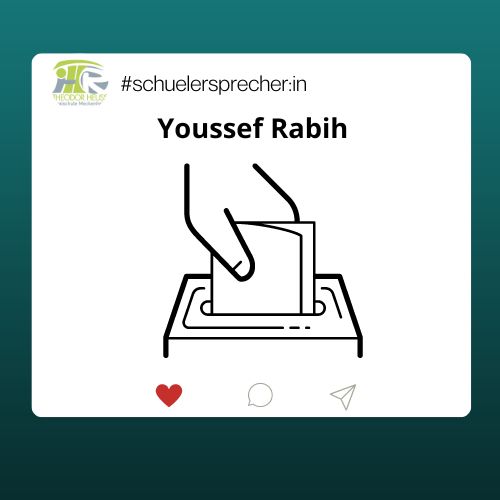 Mein Name ist Youssef, ich komme aus der 9d und ich bin 15 Jahre alt. Mein Hobby ist hauptsächlich Fußballspielen. Ich möchte Schülersprecher werden, weil ich die Meinungen und Bedürfnisse der Schüler vertreten möchte. Ich bin diesbezüglich auch sehr hartnäckig. Vielen Dank!