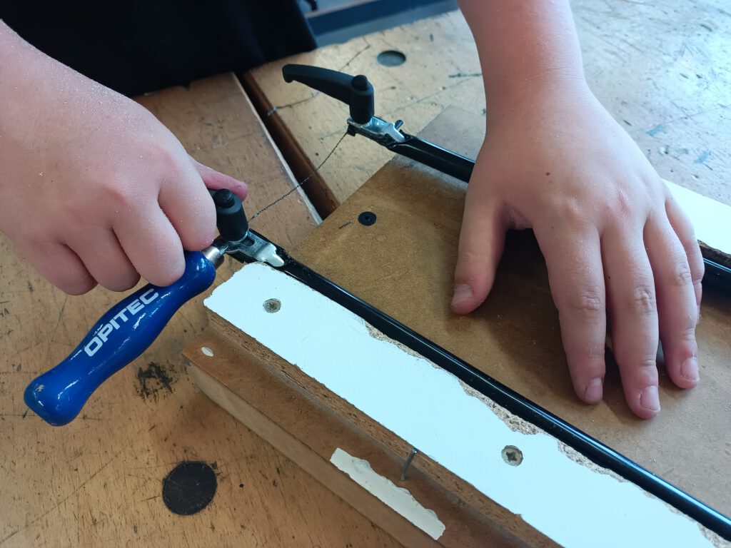 In Stufe 6 haben alle Schülerinnen und Schüler das Fach Werken. Ein Jahr lang bekommen sie so die Möglichkeit, eine solide Entscheidungsgrundlage für eine eventuelle Kurswahl „Technik“ auszubilden. Ein erstes Projekt zum Thema „Holzbearbeitung“ sind Entwurf und Fertigung einer Malerpalette. Zum Einsatz kommen u.a. Reissnadel zum Übertragen der Zeichnung und diverse Werkzeuge zur Holzbearbeitung. Mit Einhandzwingen wird das Werkstück fixiert und dann mit der Laubsäge ausgeschnitten. Ein kleiner Rand neben dem „Riss“ (Bleistiftlinie) verbleibt zunächst, sodass dann mit Schleifpapier die endgültige Form erstellt werden kann. Für das Daumenloch wird bereits mit der Ständerbohrmaschine gearbeitet. Das nur drei Millimeter starke Pappelsperrholz erfordert Feingefühl und Geduld. Nach Fertigstellung und Benotung kann die Palette mit nach Hause genommen werden. Die in der Holzbearbeitung erlernten Fertigkeiten werden später sowohl in der Kunststoff- als auch in der Metallbearbeitung benötigt.